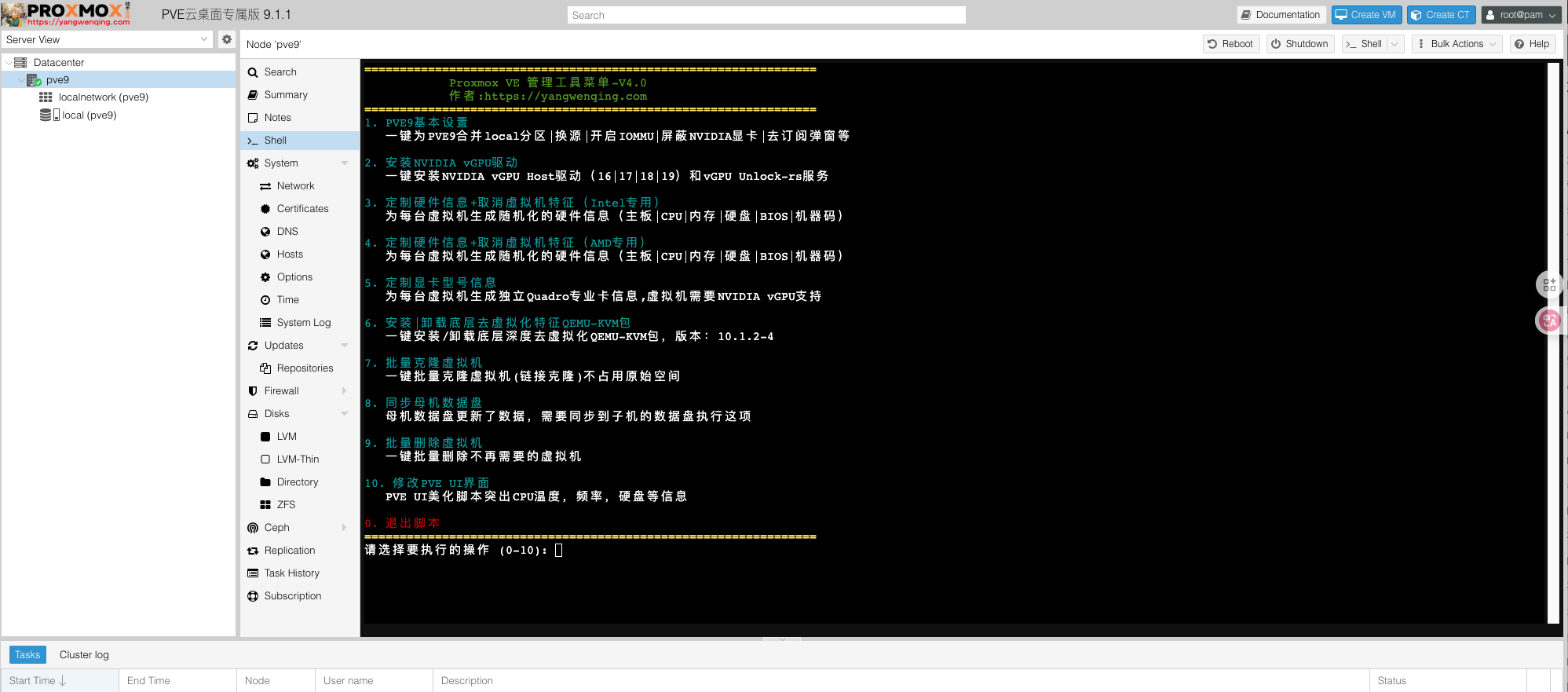 2)集成一键初始化脚本:一键为PVE9合并local分区|换源|开启IOMMU|屏蔽NVIDIA显卡|去订阅弹窗等;