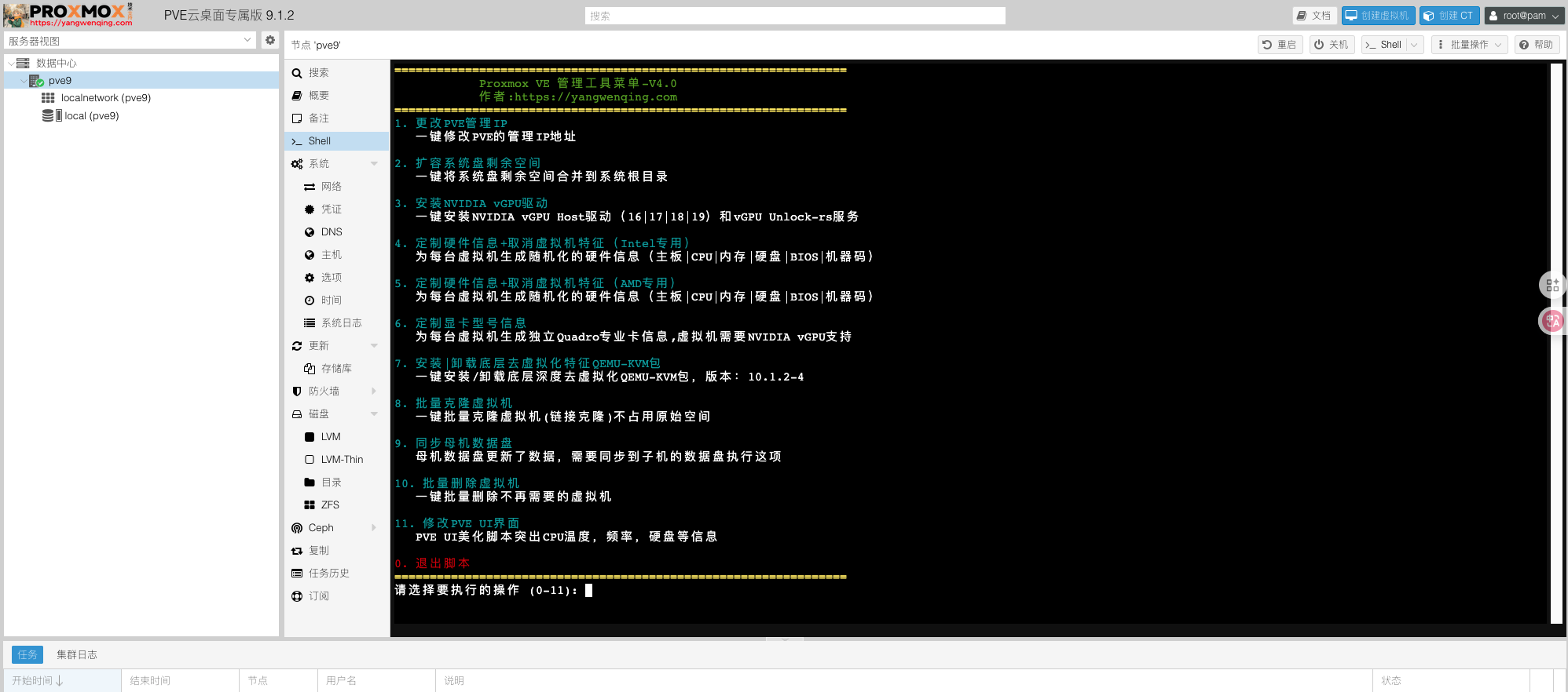 7)提供PVE脚本(更改PVE管理IP|扩容系统盘剩余空间|定制硬件信息|模拟显卡信息|安装/卸载去虚拟化KVM包|批量克隆/同步/删除虚拟机)登录SSH自动运行;