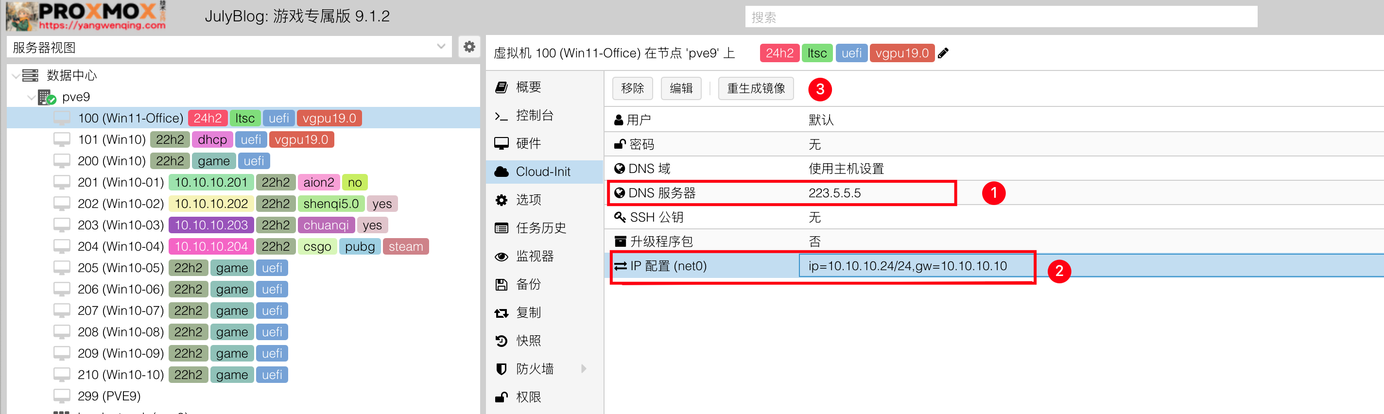 4)最后就是把虚拟机开机,然后把IP和DNS配置上去,点击重生成镜像,等待180秒。IP就能自动触发修改了。