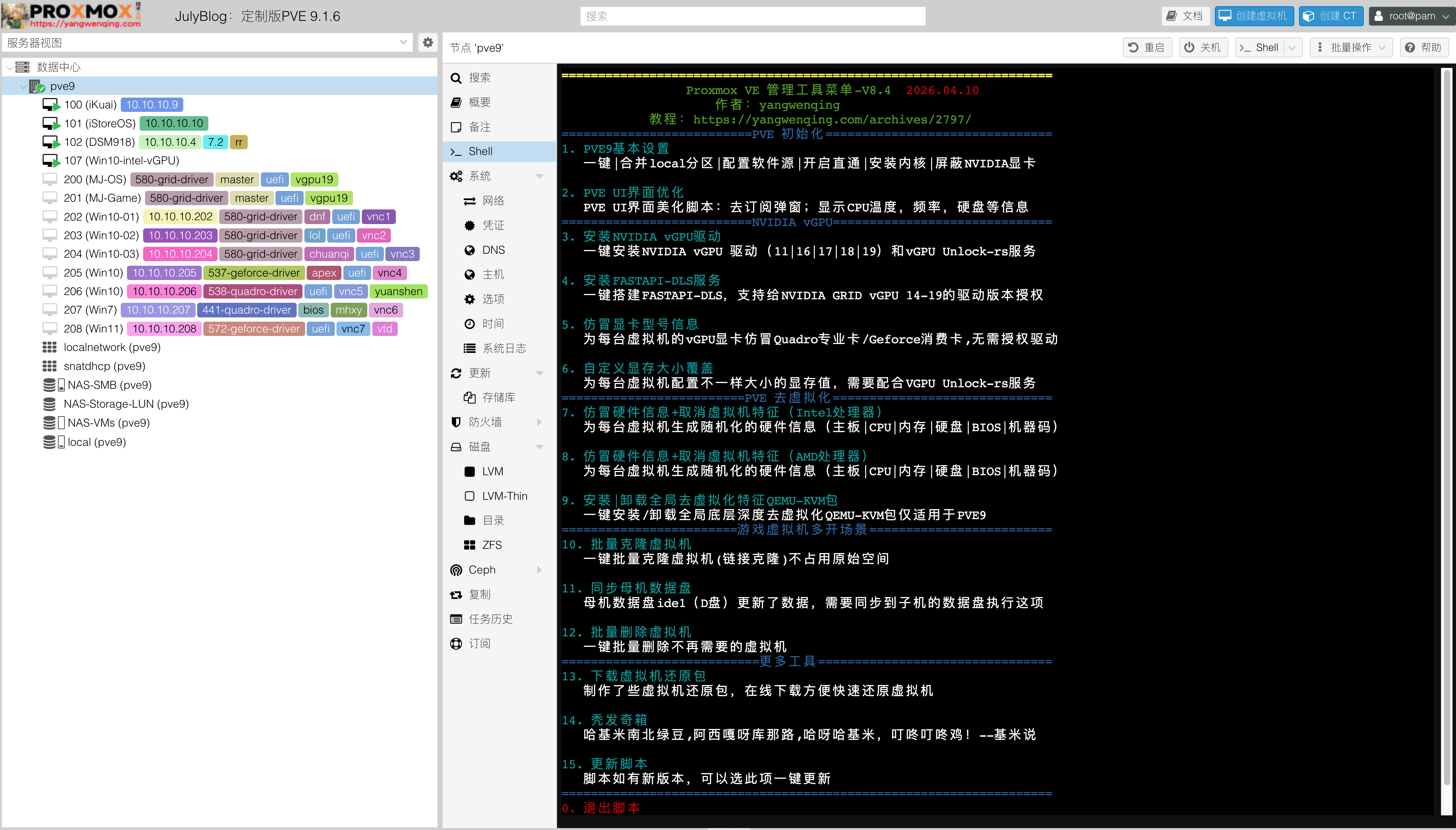 6)提供PVE脚本(更改PVE管理IP|扩容系统盘剩余空间|安装vGPU驱动11/16/17/18/19|安装/卸载去虚拟化KVM包|定制硬件信息|模拟显卡信息|批量克隆/同步/删除虚拟机)登录SSH自动运行;
