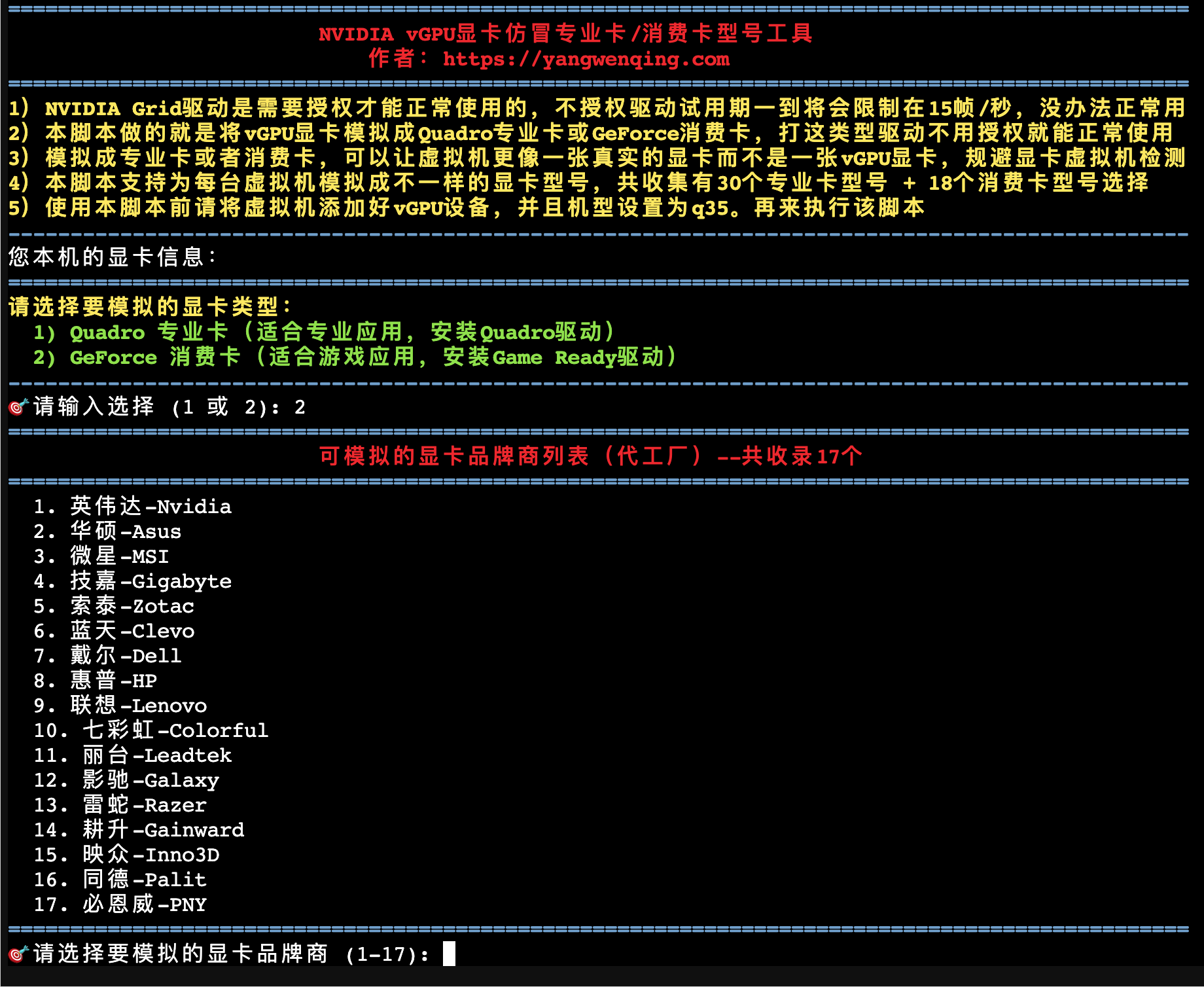 6)集成一键随机显卡脚本:给每台虚拟机生成一张Quadro专业卡/Geforce消费卡,虚拟机需要NVIDIA vGPU支持;