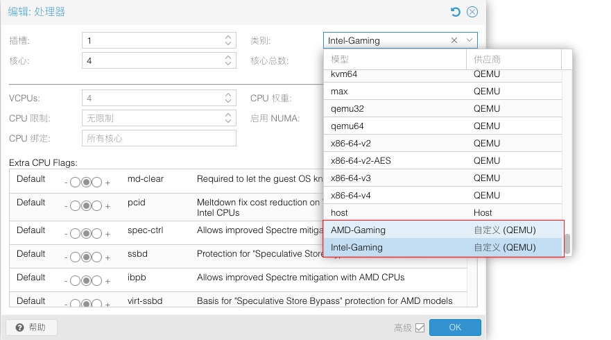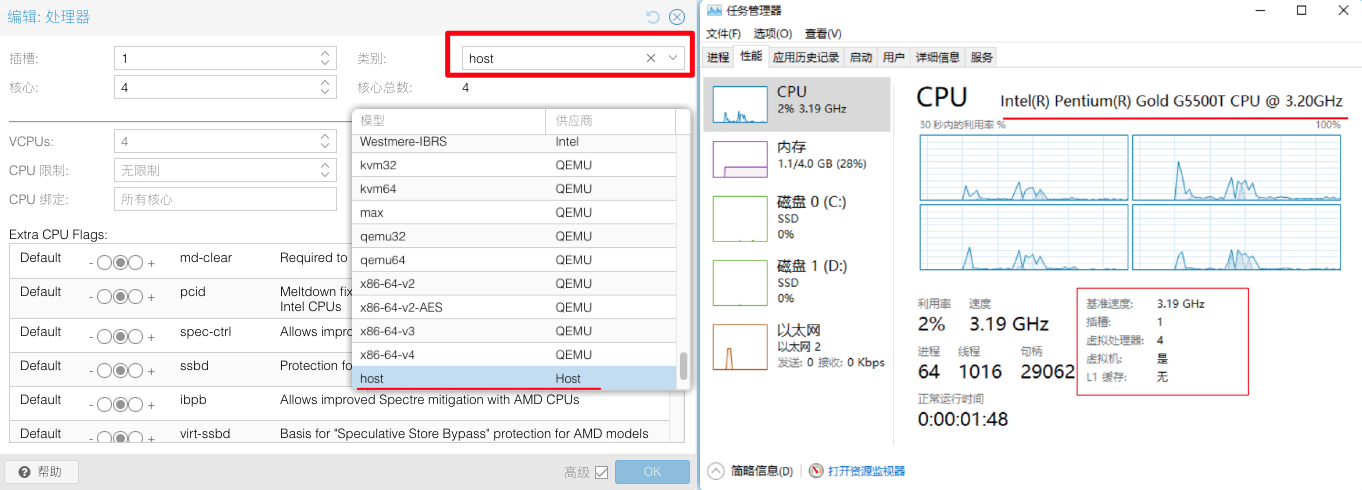 通常我们的PVE虚拟机习惯把CPU的类别设置为host模型,这样既能获得与宿主机CPU几乎完全相同的指令集和性能又可以在虚拟机看到的CPU就是宿主机CPU型号。