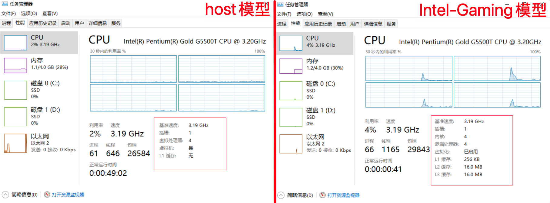 host模型和使用自定义Intel-Gaming模型差别还是挺大的,取消了虚拟机特征和支持套娃在虚拟机跑hyperV,安卓模拟器,docker和玩些不让在虚拟机运行的端游都是没有问题的。自定义CPU型号